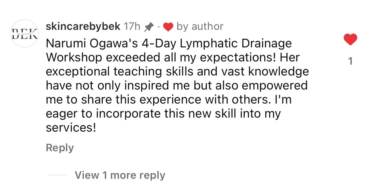Narumi's hands-on approach to teaching MLD was very helpful and fascinating. I do not have a background in bodywork, and although connecting with people in this way for the first tme did feel intimidating, I was able to feel safe enough to leave my comfort zone, thanks to Narumi and my amazing colleagues.